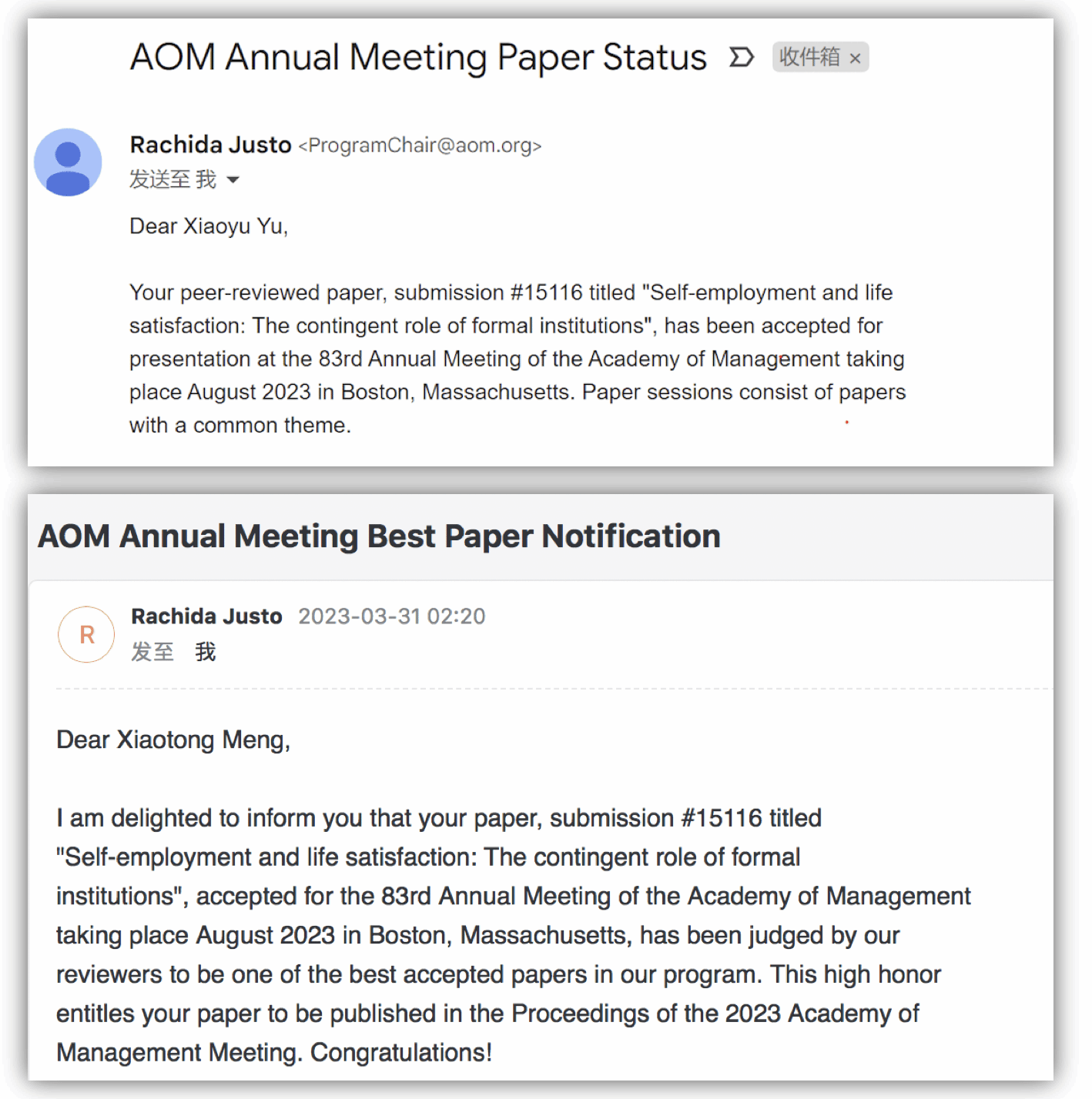管理学院于晓宇教授、孟晓彤博士获AoM2023最佳会议论文奖